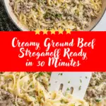 A quick and comforting stroganoff made with ground beef, egg noodles, mushrooms, and a creamy savory sauce, ready in just 30 minutes.