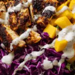 A vibrant and flavorful bowl featuring spicy jerk chicken served over a refreshing mango slaw, topped with a creamy honey lime dressing. This dish is bursting with bold Caribbean flavors, balancing heat with sweetness and tang.