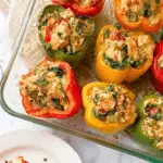 If I want a vegetarian version, I substitute the chicken with chickpeas or lentils. I also enjoy topping the peppers with shredded mozzarella or extra feta before baking for a cheesier finish.