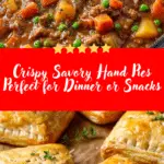 Flaky homemade savory hand pies filled with seasoned ground beef, vegetables, and a rich sauce, baked until golden and perfect for a portable lunch, dinner, or hearty snack.