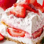 A cool and creamy no-bake dessert with layers of graham crackers, sweetened cream cheese, whipped topping, and fresh strawberries—perfect for summer gatherings or a refreshing treat.