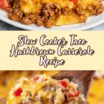 A hearty slow-cooker casserole made with seasoned ground beef, hashbrowns, creamy sauce, and melted cheddar cheese for an easy, comforting taco-inspired meal.
