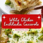 A creamy and comforting white chicken enchilada casserole made with tender shredded chicken, layered tortillas, and a rich white sauce, baked until bubbly and golden.