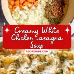 A cozy, creamy white chicken lasagna soup made with tender shredded chicken, broken lasagna noodles, spinach, and a rich cheesy broth for an easy one-pot comfort meal.